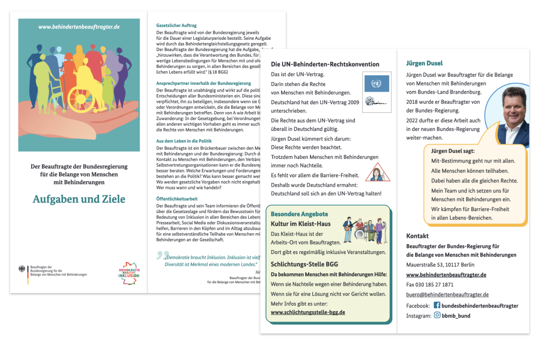 Im Frühjahr 2024 hat unsere Agentur eine Basisinformation des Beauftragten der Bundesregierung für die Belange von Menschen mit Behinderungen in drei Formaten erstellt: einen Flyer in Alltagssprache, einen Flyer in Leichter Sprache sowie ein barrierefreies Webangebot. Fast acht Millionen Menschen leben in Deutschland mit körperlichen oder geistigen Behinderungen oder eingeschränkten Sinneswahrnehmungen. Sie haben Rechte, auch auf gute Kommunikation. Denn die gleichwertige Teilhabe aller Menschen am öffentlichen Leben sollte längst überall eine Selbstverständlichkeit sein